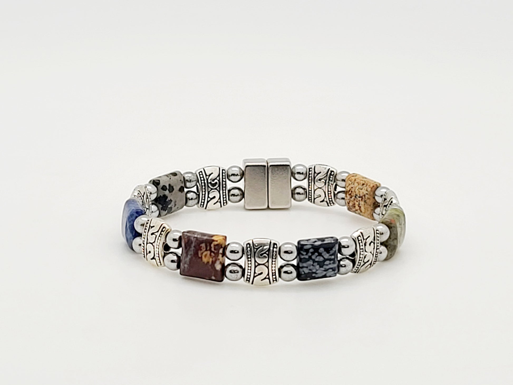 This neutral combination features the stones Dalmatian Jasper, Sodalite, Cappuccino, Snowflake Obsidian, Unakite, and Picture Jasper.
