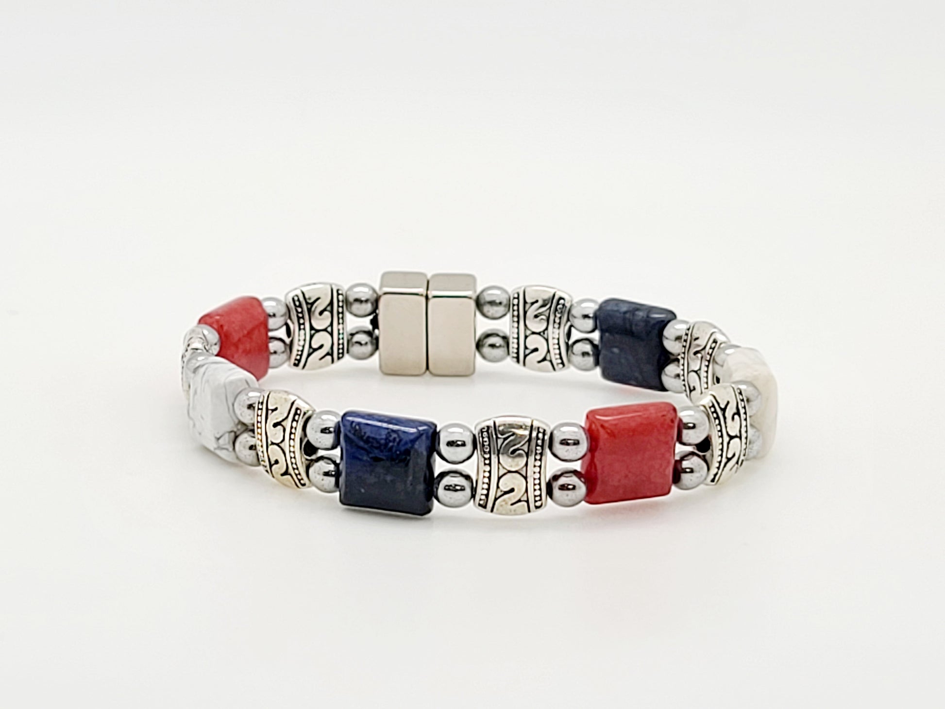This American themed combination features the stones Red Jade, White Howlite, and Dumortierite.